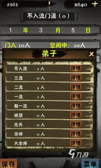 游戲中玩家可以創(chuàng)立自己的門派,每個(gè)門派中都有不同的等級(jí),如最低是不入流,經(jīng)過三流、二流等逐漸爬升,最高的等級(jí)是大宗師。玩家通過訓(xùn)練自己的弟子,逐漸增強(qiáng)門派的實(shí)力。