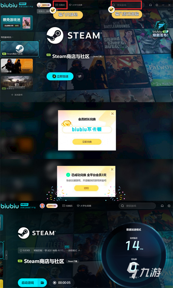 如果說希望領取更多加速福利也是可以的,小伙伴們可去打開軟件的兌換,然后在其中輸入口令【biubiu不卡頓】,如此便可成功解鎖72h的加速時長了,助力玩家獲得更好的游戲體驗。