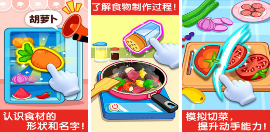 可愛小寶寶會在游戲中逐漸掌握食物的名稱和營養(yǎng)元素,這是本游戲的最終目標(biāo)。超級吸引兒童眼光的卡通小廚房,塑造了極其誘人的飯菜制作過程,玩家可以使用各種素材親自切菜和煮飯,也可以在家長指導(dǎo)下烘烤蛋糕和制作沙拉。游戲里不僅有各種中餐和西餐的制作方式,也有廚房里的各種安全小知識,提醒電和煤氣的注意事項(xiàng)。