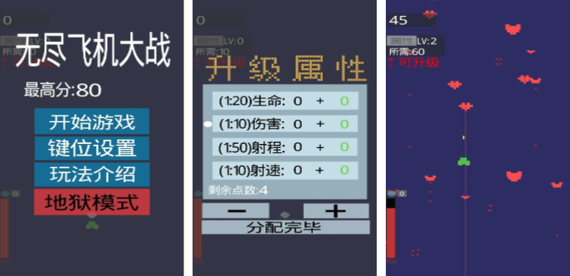 無(wú)盡飛機(jī)大戰(zhàn)是一款無(wú)比有趣的休閑類飛機(jī)游戲,你可以單指操控一臺(tái)非常迷你的飛機(jī)進(jìn)行戰(zhàn)斗,將畫(huà)面中紅色的敵人戰(zhàn)斗機(jī)統(tǒng)統(tǒng)打爆就可以獲勝。本作獨(dú)創(chuàng)了提升屬性的機(jī)制,小飛機(jī)升級(jí)后可以獲得幾個(gè)屬性點(diǎn),你可以利用屬性點(diǎn)提升戰(zhàn)斗機(jī)的生命值和傷害值。這是款可玩性挺高的單機(jī)飛行游戲,簡(jiǎn)約的畫(huà)質(zhì)也給大家?guī)?lái)了新鮮感和刺激感!