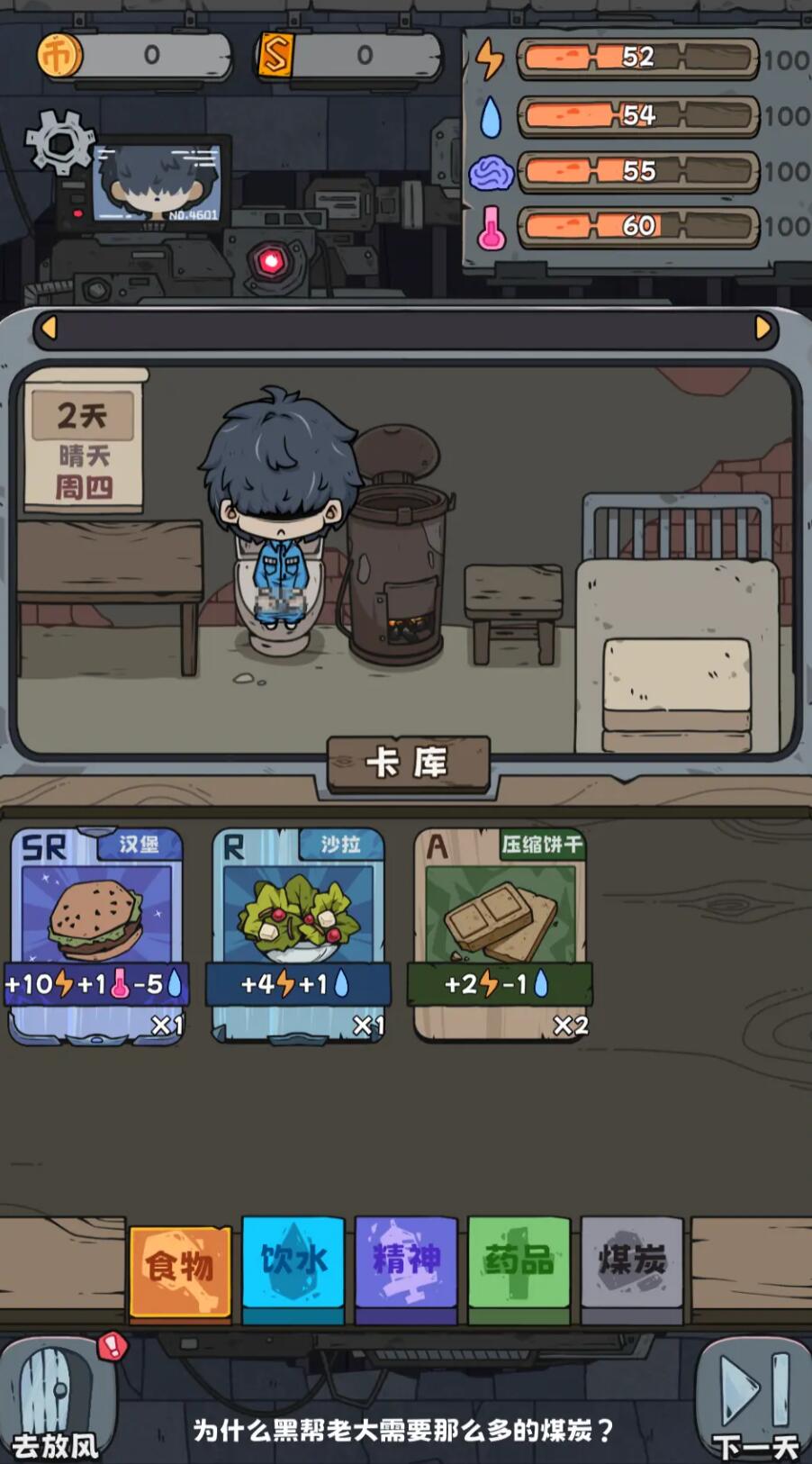生存和抽卡綁在一起,每天就靠抽卡過(guò)日子,食物水藥品全得靠運(yùn)氣。交易市場(chǎng)價(jià)格也全部隨機(jī)昨天還能賣50的面包卡,今天就跌到20,將賭狗的風(fēng)險(xiǎn)直接拉滿。精神值是本作的一個(gè)特色,抽到SSR還好,抽不到的話掉得更快,但是其中也有命運(yùn)齒輪系統(tǒng),能改概率,但需要資源鋪墊,后期解鎖廢卡換ssr的功能之后,體驗(yàn)非常解壓。