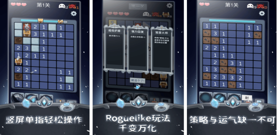 濃郁的肉鴿元素同時,在結(jié)合著經(jīng)典的掃雷玩法,其中涵蓋了博弈模式以及經(jīng)典模式等等,在各種方塊中都會有不同的數(shù)字,而翻開數(shù)字后,就會顯示出相應周圍的雷區(qū),每局游戲開始的時候都會設(shè)立9個雷區(qū),還有4個寶箱,你成功避開雷區(qū),尋找到大量寶箱后即可順利解鎖,擊殺所有的大boss。