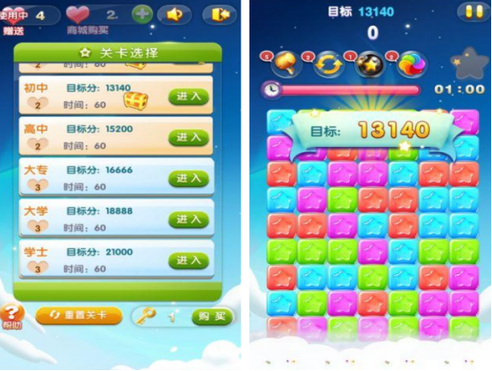 在豐富多彩的消除星星世界當中,感受休閑又好玩的這種特色,看上去比較簡單,點擊相同的方塊以后,完成消除,也沒有任何的時間限制,不過你想要在每個關(guān)卡當中,達到目標要求的分數(shù),還是需要開動腦筋的。如果想要挑戰(zhàn)難度更高的,在關(guān)卡選擇的時候,以目標分數(shù)比較高的,點擊進入其中以后,就可完成相應的挑戰(zhàn)。