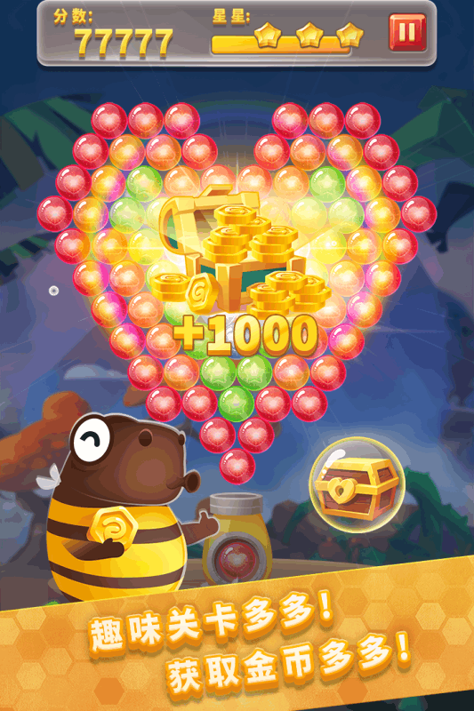 首先我們的玩家看到的就是這款《泡泡龍熊貓傳奇》手游,奇特的環(huán)境令我們的消除玩法感受到更加絕美的表現(xiàn),操作上就需要去控制發(fā)射器,相同顏色的泡泡瞄準(zhǔn)并且進(jìn)行集合,達(dá)到三個(gè)同樣數(shù)量的話就可以做到消除奪得目的了,游戲展現(xiàn)出來的畫面具備著明亮的色彩效果,氛圍也是相當(dāng)?shù)臏剀啊?/p>