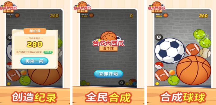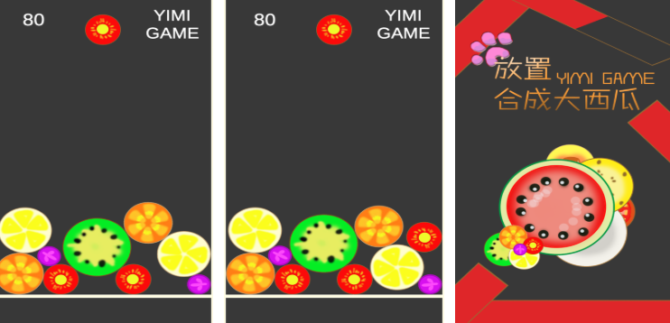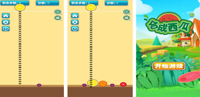 合成西瓜屏幕中央是開闊的合成區(qū)域,各種大小不一的水果會隨機從頂部往下落,玩家用手指左右滑動,就能調(diào)整水果的投放位置,只要相同大小的水果在任意方向碰到一起,合并體積變大一圈,變成更高等級的水果,最終目標就是合成出圓滾滾、體積最大的西瓜。