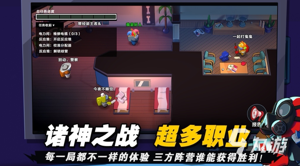 多人可以開(kāi)啟房間,一起進(jìn)行熱血游戲。玩家需要時(shí)刻小心身邊的破壞者,與狼人殺的玩法類(lèi)似,實(shí)時(shí)進(jìn)行語(yǔ)音討論揪出其中的破壞者,你要仔細(xì)辨別身邊人的話是真話還是謊話。