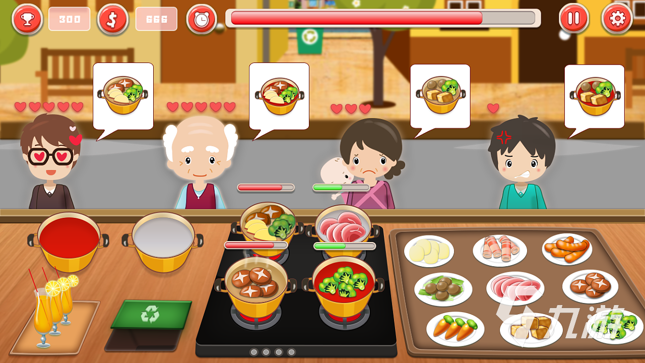 這是一個吃了會讓人開心的火鍋店,在這個店鋪里面,玩家需要根據(jù)顧客的需求為他配置相應的火鍋,讓他在品嘗的過程中對店鋪產生評價。當然,在配置的過程中,速度一定要快,因為顧客的耐心是有限的,如果沒有在規(guī)定的時間內滿足顧客的需求,那么顧客可是會跑掉的。