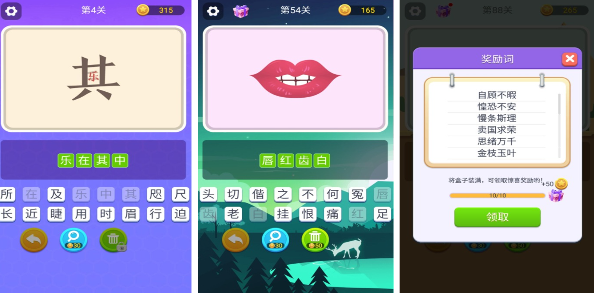 猜詞語也是一個(gè)能夠猜測(cè)成語的經(jīng)典解謎主題手游,充滿創(chuàng)新的解謎元素跟詞語知識(shí)進(jìn)行結(jié)合,比較超前的拼音拼湊猜詞語設(shè)定也是亮點(diǎn),畫面塑造更加簡(jiǎn)約同時(shí)也大大提升了運(yùn)行速度,超多的詞語等待著玩家拼拼音進(jìn)行還原,與眾不同的猜謎解謎方式吸引了不少詞語愛好者,在不斷挑戰(zhàn)猜詞語過程中你的智商會(huì)得到啟發(fā),無可挑剔的互動(dòng)性質(zhì)也是詞語游戲粉絲最愛。
