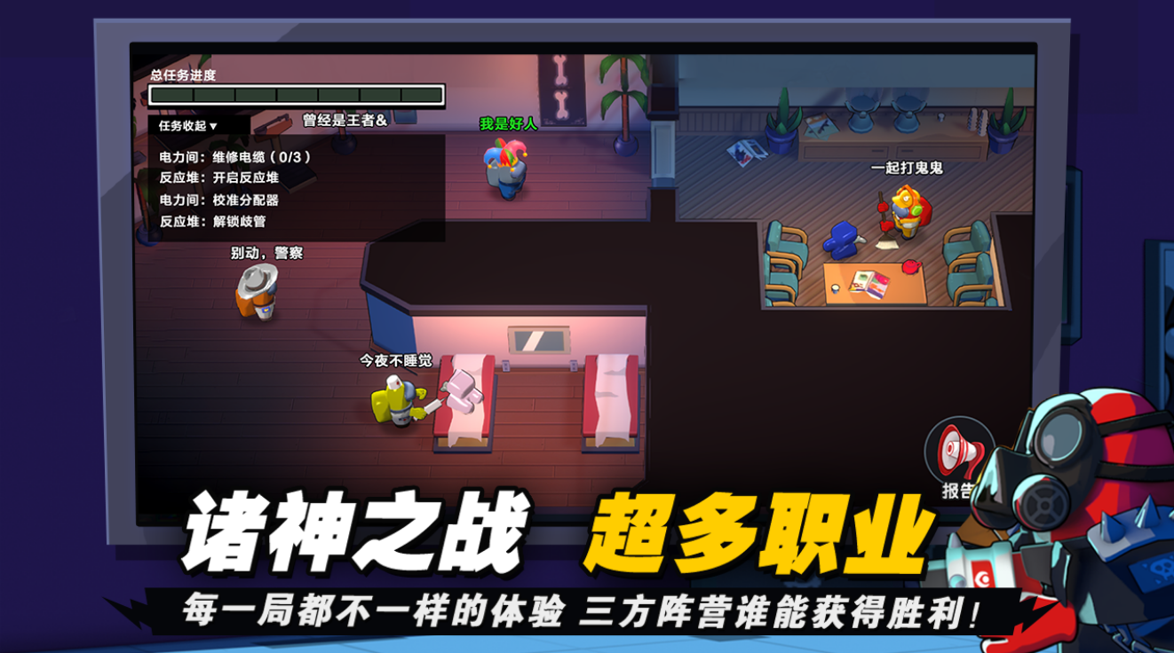 太空殺是太空飛船中的狼人殺游戲,每個玩家將扮演性格和能力特異的太空隊員,彼此隱瞞真實(shí)身份,通過狼人殺的方式來獲得游戲最終的勝利。