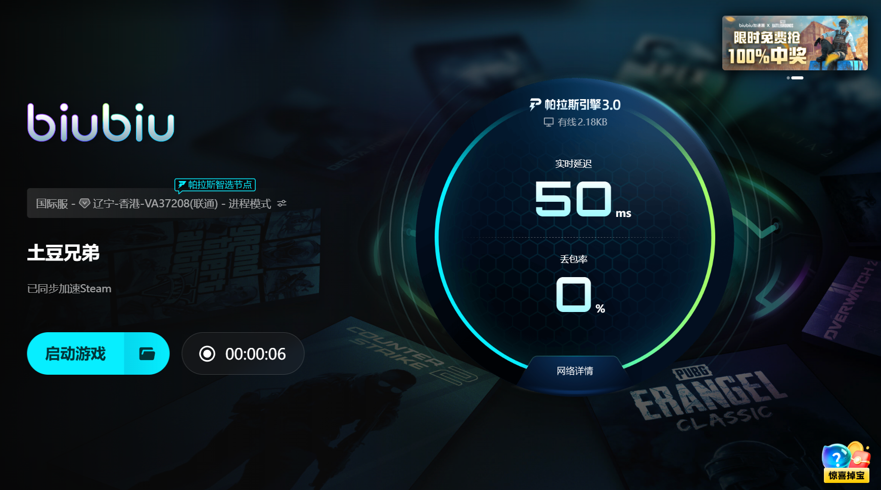 操作過程同樣十分便捷,只需啟動(dòng)biubiu客戶端即可。搜索土豆兄弟,一鍵開啟加速,幾秒鐘即可接入最佳線路,全程自動(dòng)優(yōu)化,無(wú)需任何手動(dòng)設(shè)置。后臺(tái)占用極低,不會(huì)影響電腦性能,還能順便加速其他Steam游戲,省心又方便。