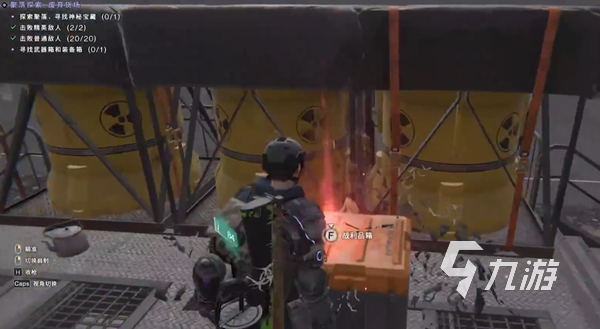 在廢棄貨場這里的區(qū)域范圍內(nèi)我們可以看到三個并排放置的污染儲罐,神秘寶藏的位置就在儲罐的背面。大家可以看到一處泛著紅光的戰(zhàn)力品箱,長按互動打開之后就能夠獲取到【圖紙:特勤鞋】。