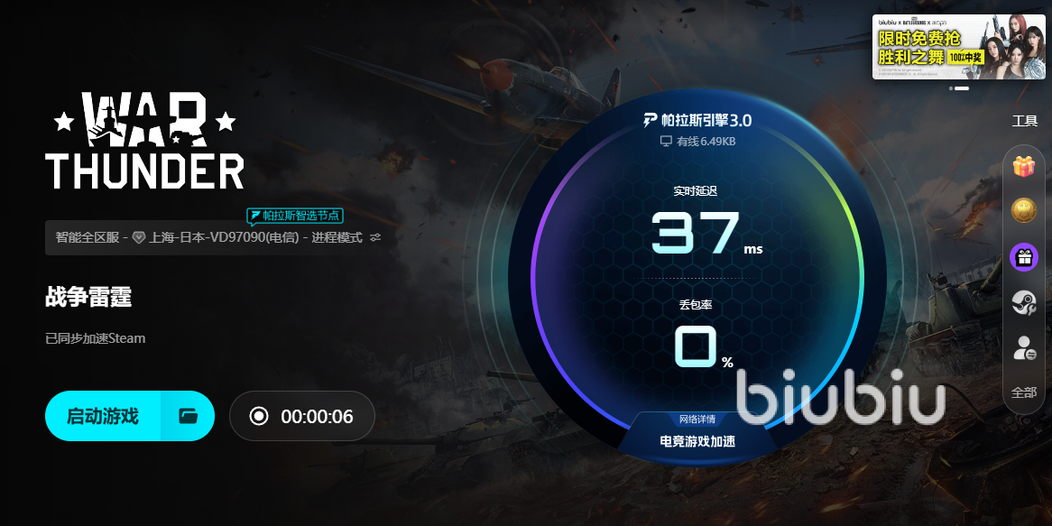 總之,面對(duì)戰(zhàn)爭雷霆加速器哪個(gè)好的問題,小編總結(jié)的原則有四個(gè)方向——網(wǎng)絡(luò)持久、效率高效、響應(yīng)快速和操作方便的原則,特別是能讓玩家簡單操作就能得到需要的效果,并且可以暢玩更多任何地方的游戲最為重要,相信升級(jí)后的biubiu能給大家滿意的答案。