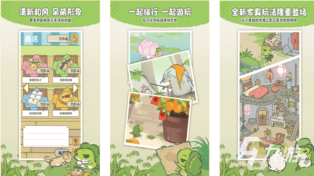 小青蛙在田園小屋中生活、學(xué)習(xí),并且偶爾外出旅行。食物和其他道具可以通過(guò)在旅途中收集或使用種植的三葉草進(jìn)行交換獲得。玩家還可以在商店使用兌換券獲得豐富的獎(jiǎng)勵(lì)。與可愛(ài)的小伙伴們一起觀賞旅行中的見(jiàn)聞吧!還有各地豐富多樣的特產(chǎn)等待著你,趕緊收集這些有趣的要素吧!