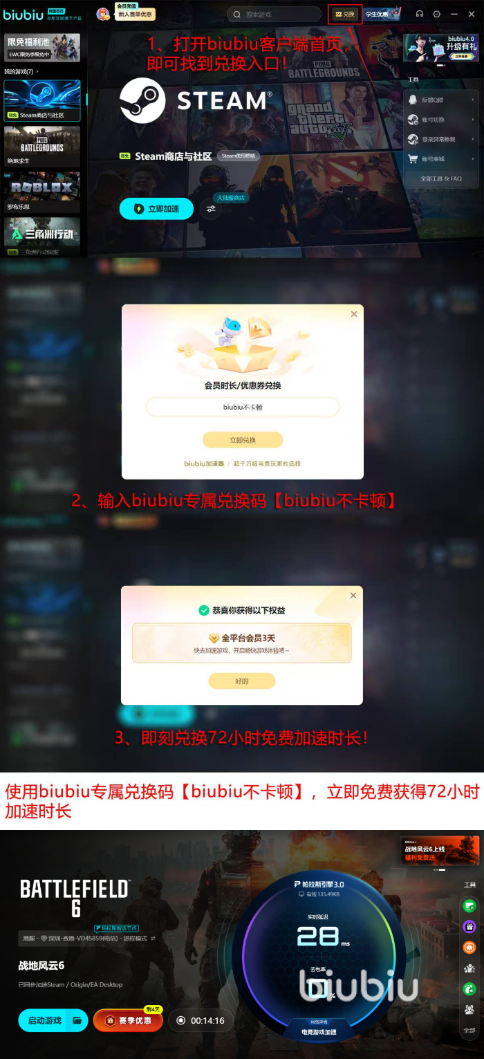 當(dāng)然,要想在《戰(zhàn)地風(fēng)云6》的戰(zhàn)場中充分發(fā)揮激光指示器的作用,流暢的網(wǎng)絡(luò)連接至關(guān)重要。許多玩家在多人對戰(zhàn)時會遇到操作延遲、標(biāo)記不同步甚至射線卡頓的問題,這種情況往往源于網(wǎng)絡(luò)波動。推薦玩家使用biubiu。biubiu為新用戶提供24小時免費使用時長,無需復(fù)雜設(shè)置即可加速戰(zhàn)地系列的所有服務(wù)器節(jié)點,顯著降低丟包率與高延遲問題。如果你想獲得更長的加速時效,只需在兌換界面輸入口令【biubiu不卡頓】,即可額外領(lǐng)取72小時免費時長。
