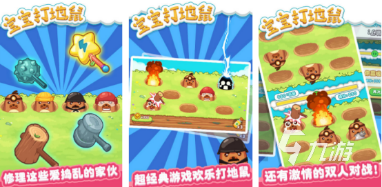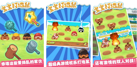 經(jīng)典模式中,讓孩子們自由自在地完成闖關(guān),在關(guān)卡中只要將所有的地鼠全部達(dá)到即可獲得更高分?jǐn)?shù),逐漸跟隨著關(guān)卡的推進(jìn)完成挑戰(zhàn)。而在雙人模式中卻可通過聯(lián)網(wǎng)的方式和其他好友相互pk,看看在規(guī)定的時(shí)間之內(nèi),誰打的地鼠數(shù)量更多。打地鼠時(shí)所用到的工具類型特別多,比如木錘等等。在這些地鼠隨機(jī)出現(xiàn)的時(shí)候,不要錯(cuò)失任何一只地鼠快速打擊。