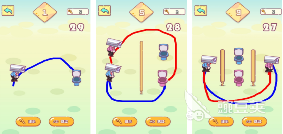 以尋找?guī)鶠橹饕诵模采w豐富的關卡內容,其中有不同的人物角色,比如男性或女性等等,這些人物角色身體上的顏色完全不同,在特別混亂的場景中,需通過連線方式,尋找到對應顏色的衛(wèi)生間。剛開始闖關時可能會覺得非常簡單,無需動腦就可讓其正常上廁所,但是隨著關卡的難度升級之后,廁所和人物之間會存在很多的難題和障礙物,三個場景中包含4個不同難度的等級,快速操作讓其第一時間上廁所。