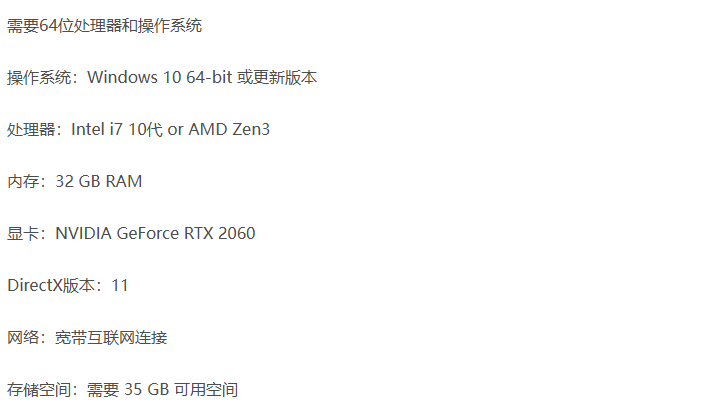 正常我們只需要8代或者10代的cpu就可以很好的運(yùn)行程序了,顯卡只要達(dá)到了1060版本及以上,就可以正常加載出來畫面,當(dāng)然想要更好的畫面效果,最好是升級到2060以上,玩的才會更好哦。存儲空間以及內(nèi)存要求,官方給出來的配置表并不高,大家基本可以滿足。
