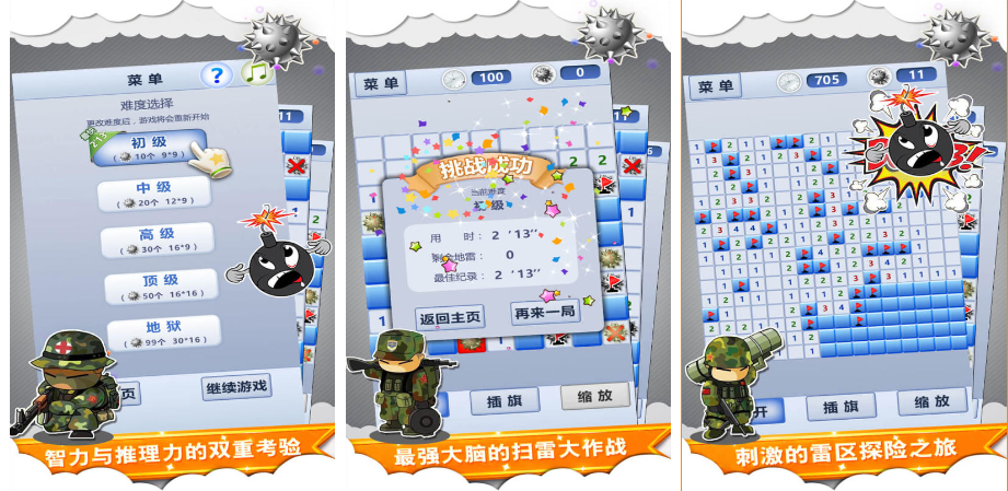 這款可是相當(dāng)經(jīng)典的,操作呢就是動(dòng)手點(diǎn)點(diǎn)點(diǎn),點(diǎn)到空地就順利打開一個(gè)格子,點(diǎn)到炸彈就咣當(dāng)炸掉,游戲就結(jié)束啦,是不是聽起來很簡單,但是掃雷也是有高手的,因?yàn)榇蜷_的格子里是有數(shù)字的,可別小看這些數(shù)字,它代表挨著它的有幾個(gè)雷,然后你就可以在確定是雷的格子上頭插旗子咯。