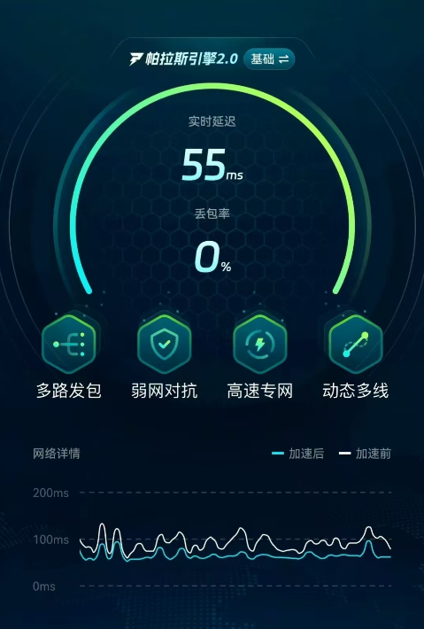 成功開(kāi)啟后,各位更是可在對(duì)應(yīng)界面來(lái)追蹤了解自身當(dāng)下具體延遲與波動(dòng),到時(shí)候也會(huì)把前后網(wǎng)絡(luò)狀況數(shù)據(jù)對(duì)比給清晰展示出來(lái),方便用戶(hù)去實(shí)時(shí)掌握,遇到擁堵線(xiàn)路等問(wèn)題也不用在擔(dān)心了,畢竟它是能自動(dòng)來(lái)進(jìn)行匹配切換的哦。