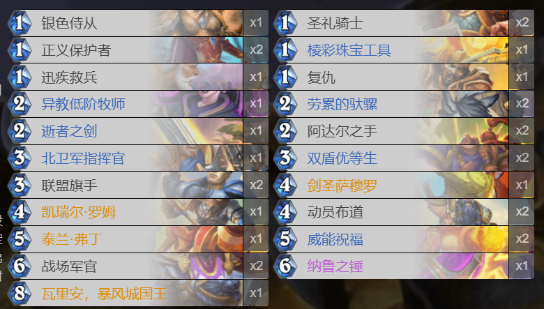 在縫合騎的卡組構(gòu)成方面,主要是以低費(fèi)的節(jié)奏隨從和騎士?jī)?yōu)質(zhì)單卡為主,例如:銀色侍從,正義保護(hù)者,迅疾救兵,異教低階牧師,逝者之劍,北衛(wèi)軍指揮官,聯(lián)盟旗手,凱瑞爾.羅姆,泰蘭弗丁,圣禮騎士,棱彩珠寶工具,復(fù)仇,勞累的馱騾,阿達(dá)爾之手,雙盾優(yōu)等生,劍圣薩穆羅,動(dòng)員布道。