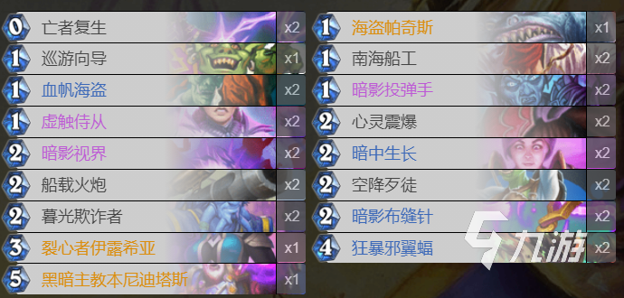 在暴風(fēng)城海盜牧的卡組構(gòu)成方面,主要是以海盜體系和暗影體系為主,例如:亡者復(fù)生,巡游向?qū)В1I,虛觸侍從,暗影視界,船載火炮,暮光欺詐者,裂心者伊露希亞,海盜帕奇斯,南海船工,暗影投彈手,心靈震爆,暗中生長,空降歹徒,暗影布縫針,狂暴邪翼蝠。