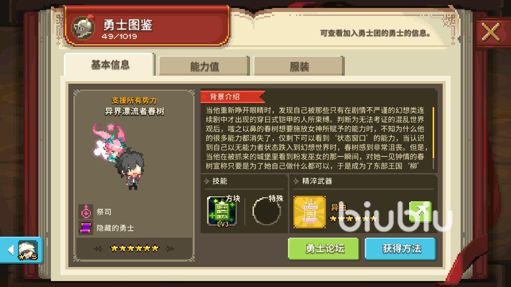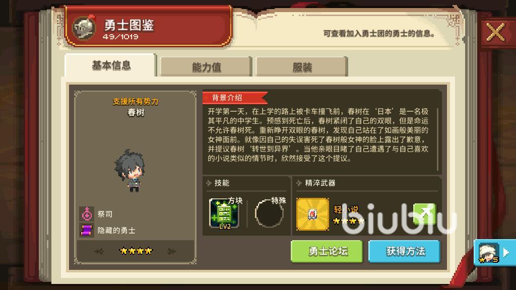 而在基礎勇士的進化過程當中,玩家們就會有概率直接解鎖春樹。此時,就可以了解到春樹是游戲當中的祭司一類,主要是在戰(zhàn)斗的時候幫助隊伍進行生命值治療。而前期的春樹優(yōu)勢不大,玩家們將其提升至六星以后,就可以讓春樹的實力全部發(fā)揮出來。