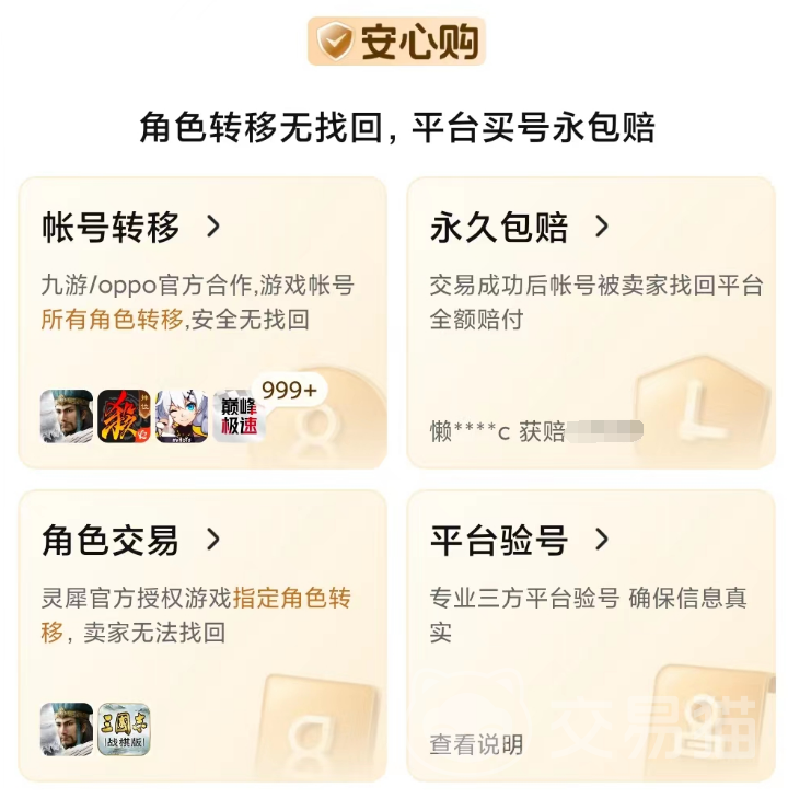 有的人可能想比較一步到位,直接花成千上萬塊購買一個(gè)極品賬號(hào),但擔(dān)心自己一次性支付這么多錢會(huì)遇見騙子,而在交易貓里,其實(shí)上當(dāng)受騙的情況很少發(fā)生,因?yàn)槠脚_(tái)有專門為安全方面定制的安心購保險(xiǎn),這個(gè)保險(xiǎn)涉及到的賬號(hào)找回安全問題范圍特別大,只要是在購買時(shí)看到帶有安心購的賬號(hào),就能享受到一個(gè)找回包賠的服務(wù),不過要注意,不是所有的商品都帶。