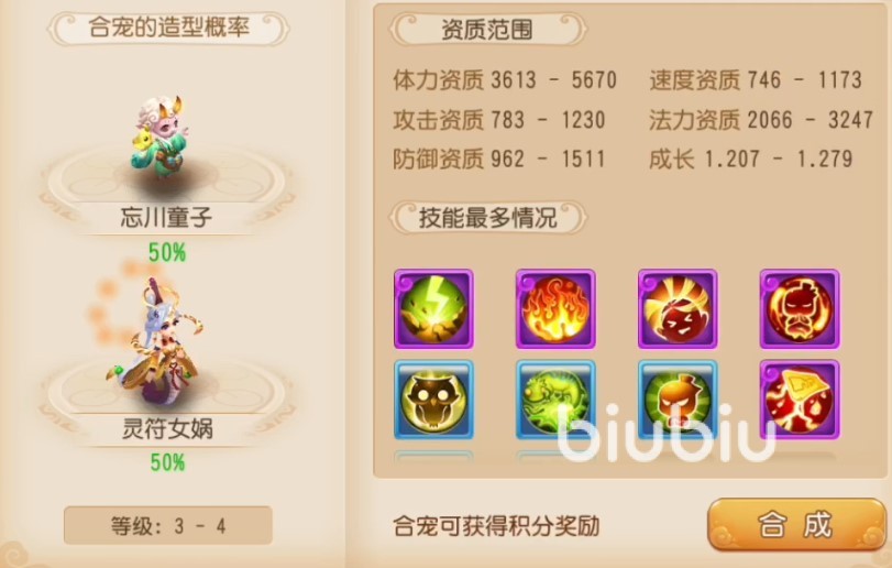 然合成是有特定條件的,必須要是自己捕捉的寵物或者是購買的寵物才可以進(jìn)行合成,當(dāng)合成了后這只小寵物會(huì)隨機(jī)繼承之前兩個(gè)寶寶的戰(zhàn)技,也就是說如果合成的兩個(gè)寵物屬性不同,那這個(gè)寶寶將會(huì)有概率獲得雙屬性的技能,有了這些技能后,還怕遇到那些特定的陣容和隊(duì)伍嗎?同時(shí)合成后的寶寶攻擊資質(zhì)、防御資質(zhì)、法力資質(zhì)、成長值、速度資質(zhì)、體質(zhì)資質(zhì)都會(huì)大概率取決于他們的平均值左右,極少數(shù)運(yùn)氣好的玩家可以獲得“青出于藍(lán)而勝于藍(lán)”的資質(zhì)寶寶,當(dāng)然這類寶寶的稀有度也是非常高的。