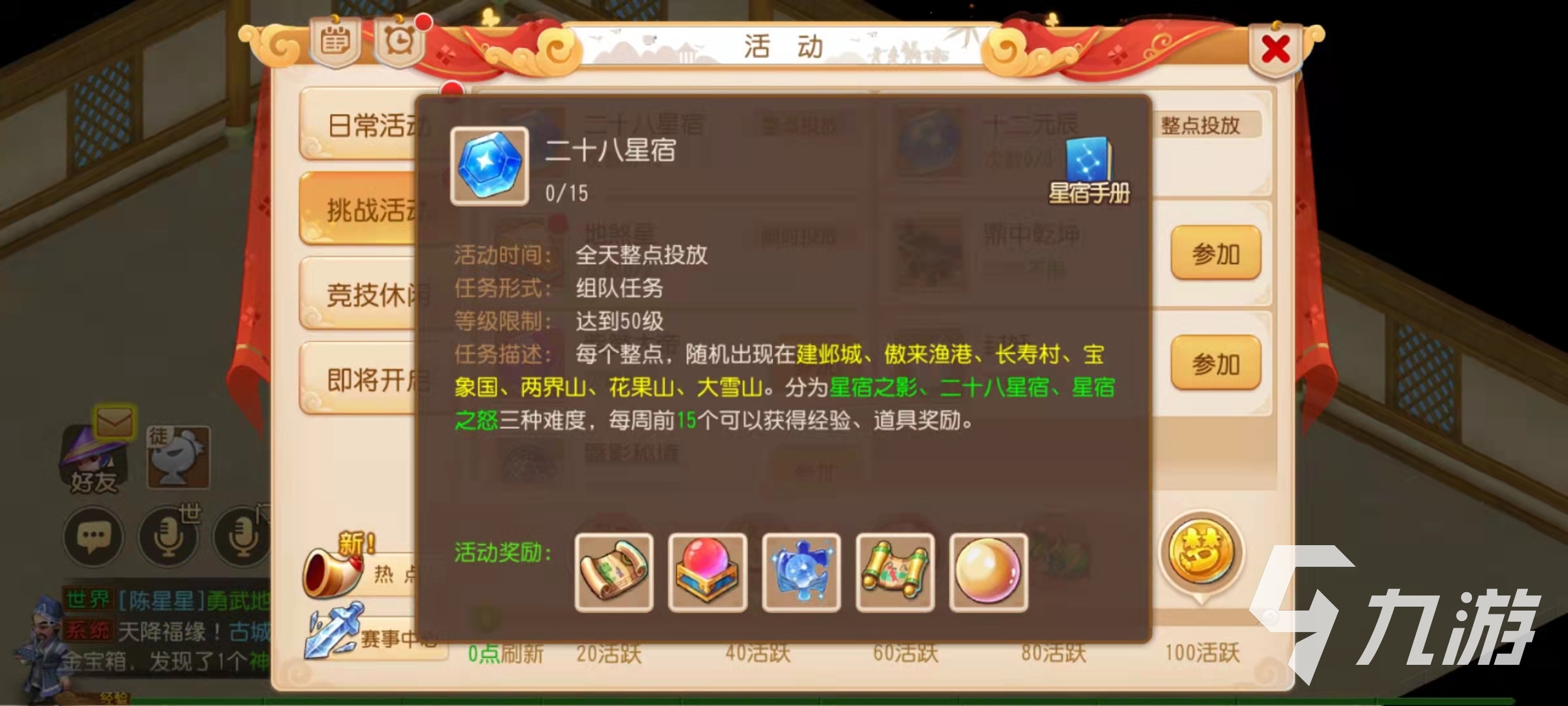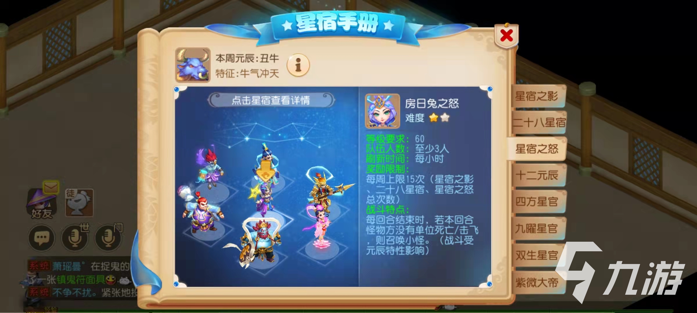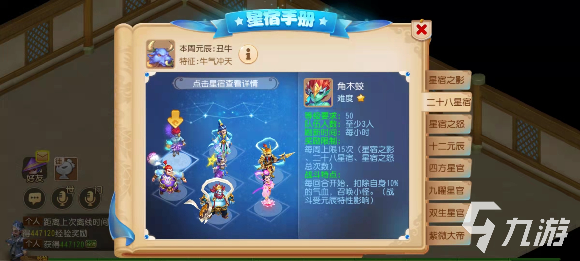 28星宿分別是角木蛟(地府)第一回合會鎖魂判官;氐土貉(普陀);房日兔(龍宮),尾火虎(方寸),亢金龍(大唐),心月狐(大唐), 箕水豹(獅駝)。28星宿分為28星宿之影,28星宿,28星宿之怒,難度逐漸上升,獎勵也是逐漸上升。28星宿之影和28星宿的怪差不多,影的怪會比較容易。