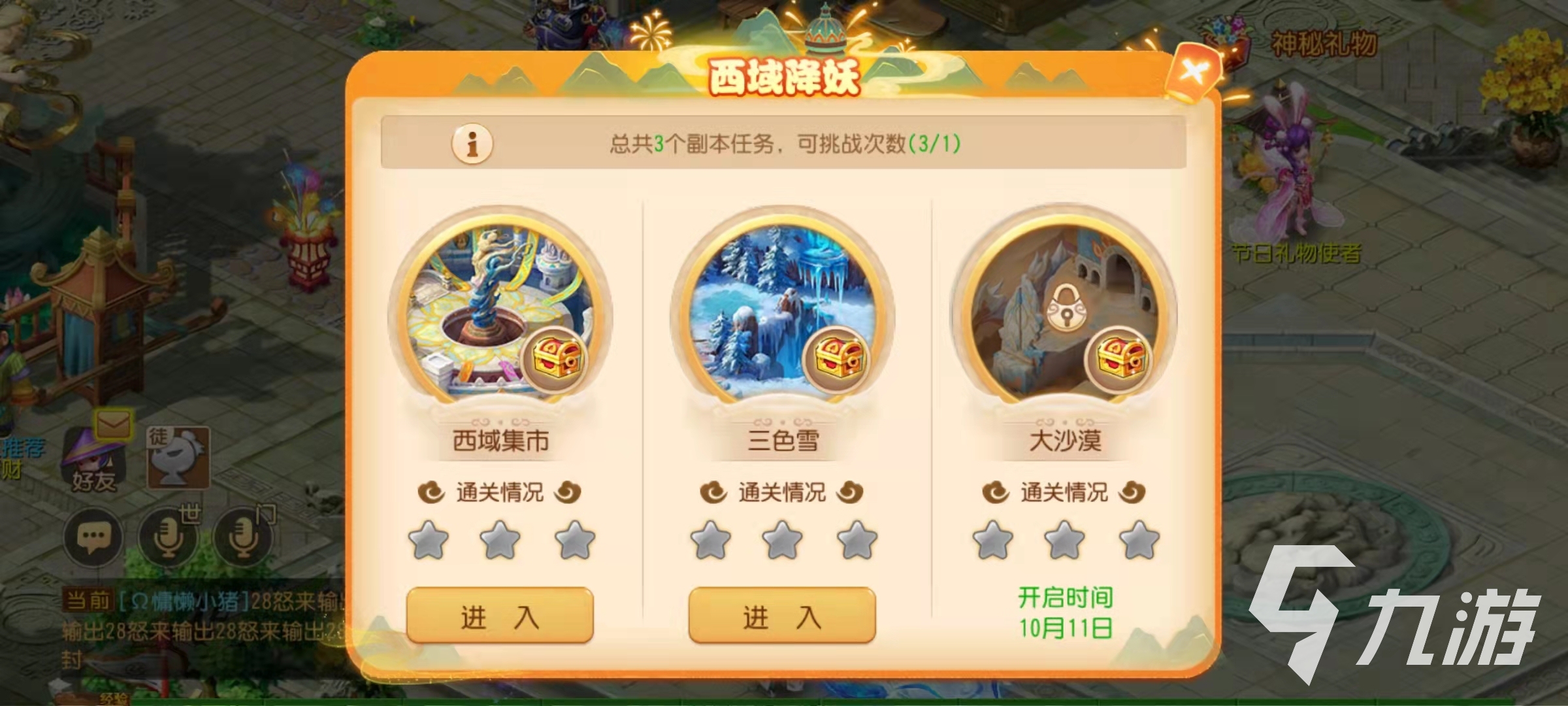 西域降妖是月迎華誕最后開啟的一個(gè)活動(dòng),西域降妖屬于是一個(gè)多人活動(dòng)副本,玩家首次通關(guān)獲取高分評價(jià),都可以獲得極其豐厚的獎(jiǎng)勵(lì)。西域降妖一共分集市、三色雪、大沙漠三個(gè)副本,副本戰(zhàn)斗由首領(lǐng)和護(hù)衛(wèi)構(gòu)成。打集市的時(shí)候建議玩家優(yōu)先處理對手的FC小怪,隨后點(diǎn)殺DT和HS小怪。保證了召喚靈的存活和擊殺收益,最好集火主怪。另外在第七回合的時(shí)候主怪會(huì)再次召喚小怪,所以玩家務(wù)必要在七回合前擊殺主怪哦。而三色雪和大沙漠副本都是一次開放的,之后玩家一定不要錯(cuò)過哦。