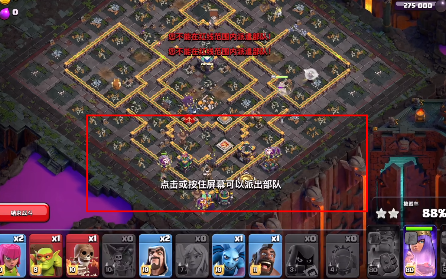 接著等閏土陣亡之后,對(duì)面基本上也就剩下方的幾個(gè)建筑物了,這里我們使用氣球兵強(qiáng)拆即可。如果對(duì)面剩下的建筑比較多,也可以丟幾個(gè)法師去女皇的后面進(jìn)行輸出,這里基本上就可以完美通關(guān)了。