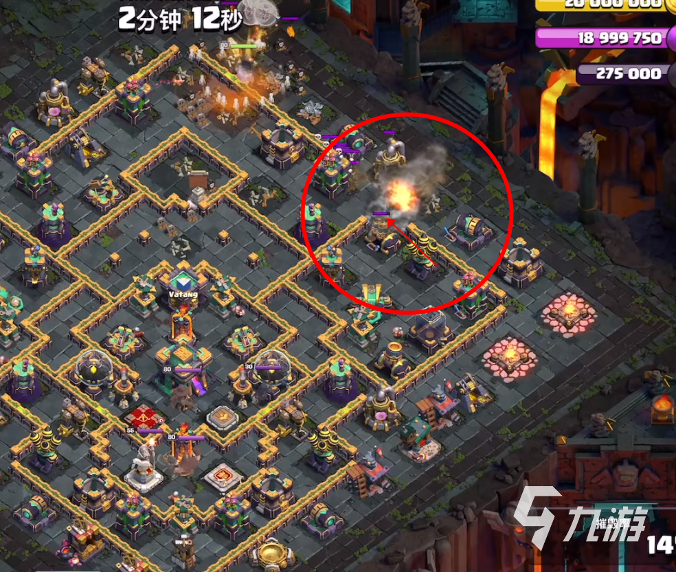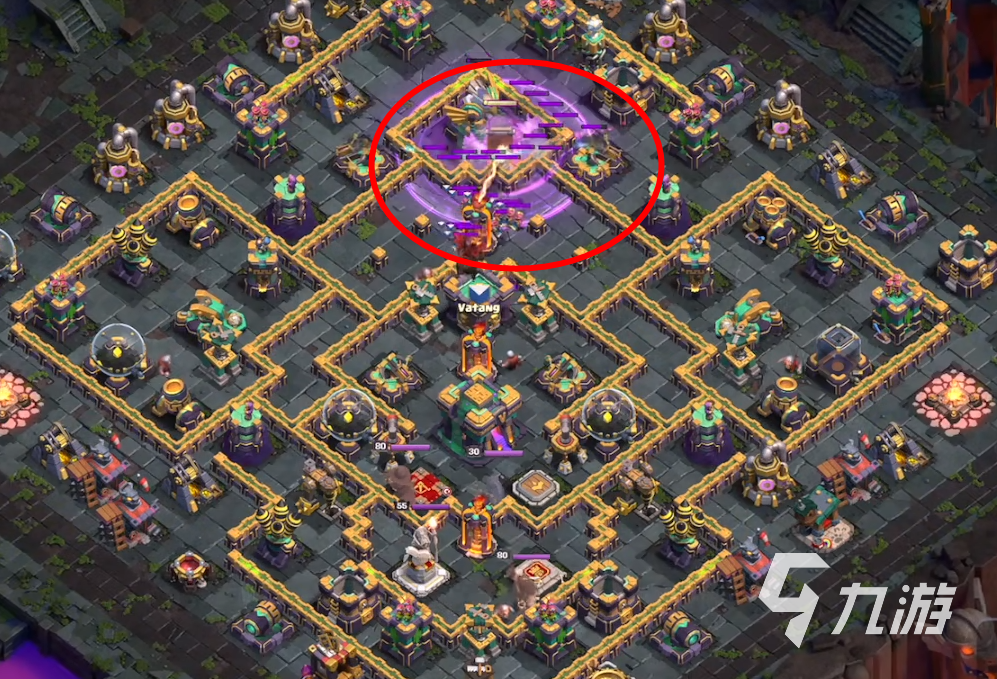 然后上圖的兩個(gè)紅圈,下面的位置丟蠻王吸引對(duì)面的火力,上面的位置派出兩隊(duì)的野豬騎士,搭配大法師以及閏土進(jìn)行強(qiáng)拆,一直到我們拆到對(duì)面的基地的時(shí)候,可以用法術(shù)藥水減免兵力的損耗。