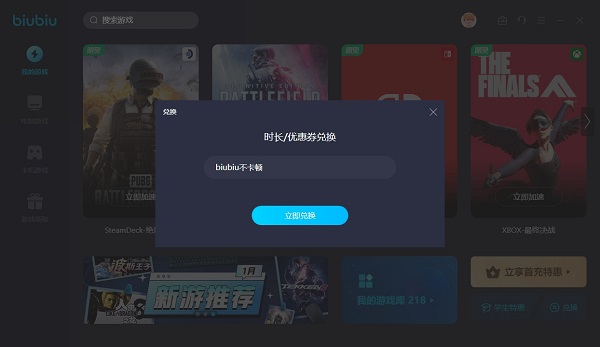 這款加速器還是很良心的,里面有不少國服、主機(jī)游戲的加速服務(wù)都免費(fèi)提供給大家,而且還時(shí)不時(shí)開展一些新游戲的限時(shí)免費(fèi)加速活動(dòng)。不過最令人感到驚喜的還是一些兌換活動(dòng)了,現(xiàn)在在軟件兌換界面中輸入“biubiu不卡頓”(注意字母小寫)就能夠直接領(lǐng)取3天的免費(fèi)時(shí)長,和新用戶領(lǐng)取的24小時(shí)疊加起來就是一共4天的免費(fèi)使用時(shí)間,還是比較不錯(cuò)的。