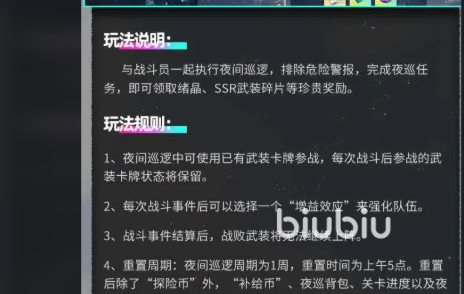 4、重置:每夜巡邏一周,早上5:00重置。重設后,“補給幣”、夜巡背包、關卡進度、夜巡 BUFF等 BUFF,都會在“探險幣”的基礎上重新設置。