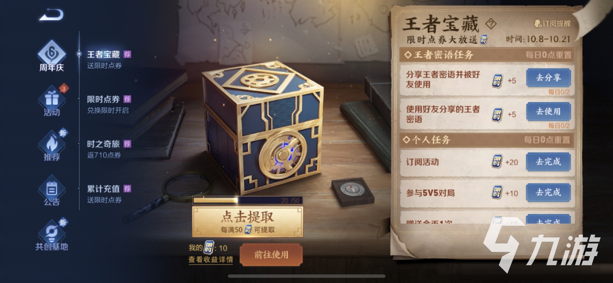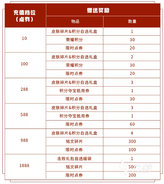 小編先簡述一下免費(fèi)點券獲得的途徑共兩個,一個是參與游戲內(nèi)的“王者寶藏”活動入口,通過完成日常的登錄、對戰(zhàn)、社交好友等類型的任務(wù)獲得,完成任務(wù)越多,獲得的點券越多,上限是1000個【限時點券】。另一個途徑是充值時贈送,具體看圖: