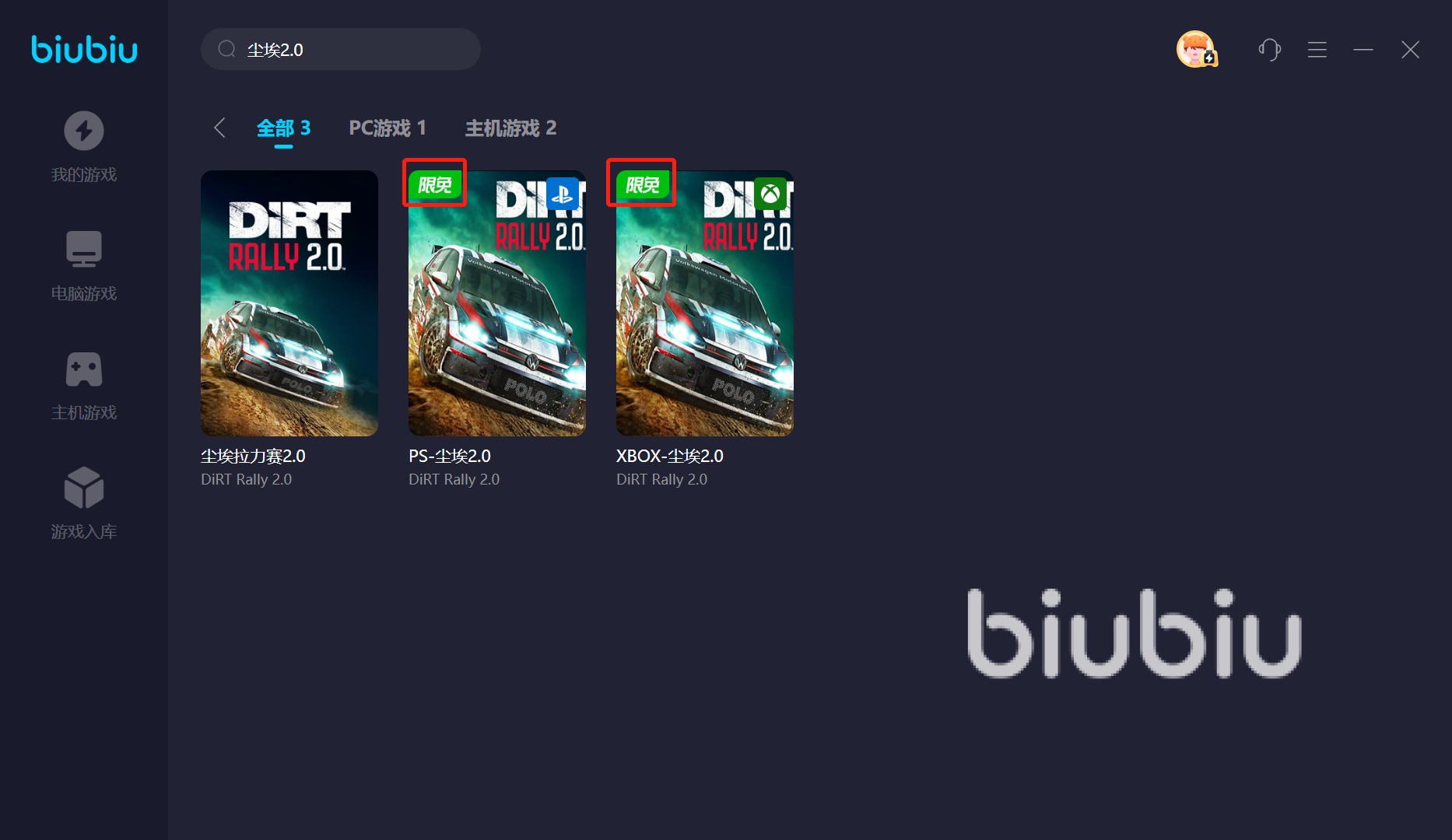 塵埃2.0不僅只有pc版本,除此之外同樣還附帶了xbox以及ps版本,大家在想玩一個版本的時候無需去進(jìn)行完整搜索,只需要輸入塵埃2.0即可呈現(xiàn)出所有的版本,而且在上方可自由選擇是PC版本還是其他版本,但如果選擇的是其他版本的話,現(xiàn)在biubiu為了加強(qiáng)這類玩家的體驗(yàn),會對非pc版本的游戲進(jìn)行限時免費(fèi)活動,不過pc玩家也不要覺得不公平,因?yàn)樵赽iubiu中還有24小時免費(fèi)會員體驗(yàn)機(jī)會去發(fā)放給新用戶。