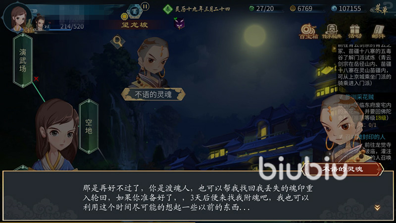 玩家進(jìn)入游戲后,可以在主頁面中看到人物列表,在人物中包括不語,在進(jìn)入望龍破后在破廟中找到不語附魂,等待三日即可獲得不語的附魂,不語是歸一老祖領(lǐng)養(yǎng)的孤兒,天性淳樸,不愛言語,是唯一得到歸一老祖真?zhèn)鞯奈渖?000靈力灌注給不語,完成對不語的附魂。