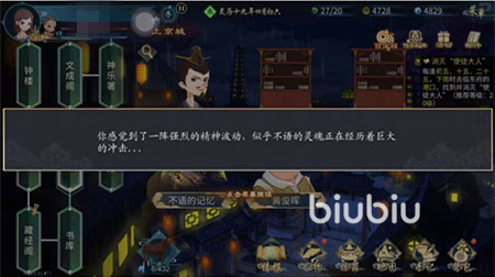 即可開啟尋找不語記憶任務(wù),前往上京城地點(diǎn),在此地點(diǎn)進(jìn)行閑逛,查找不語生前記憶,從破廟地點(diǎn)向下走到京道,即可進(jìn)入上京城地點(diǎn),在地圖中找到經(jīng)堂地點(diǎn)進(jìn)入,感覺一陣強(qiáng)烈的精神波動(dòng),不語的靈魂經(jīng)歷著重大的沖擊,出現(xiàn)了很多異常磁場,不語感覺到在這里遺失了記載四象擒龍陣的古書,即將開啟第一次記憶。