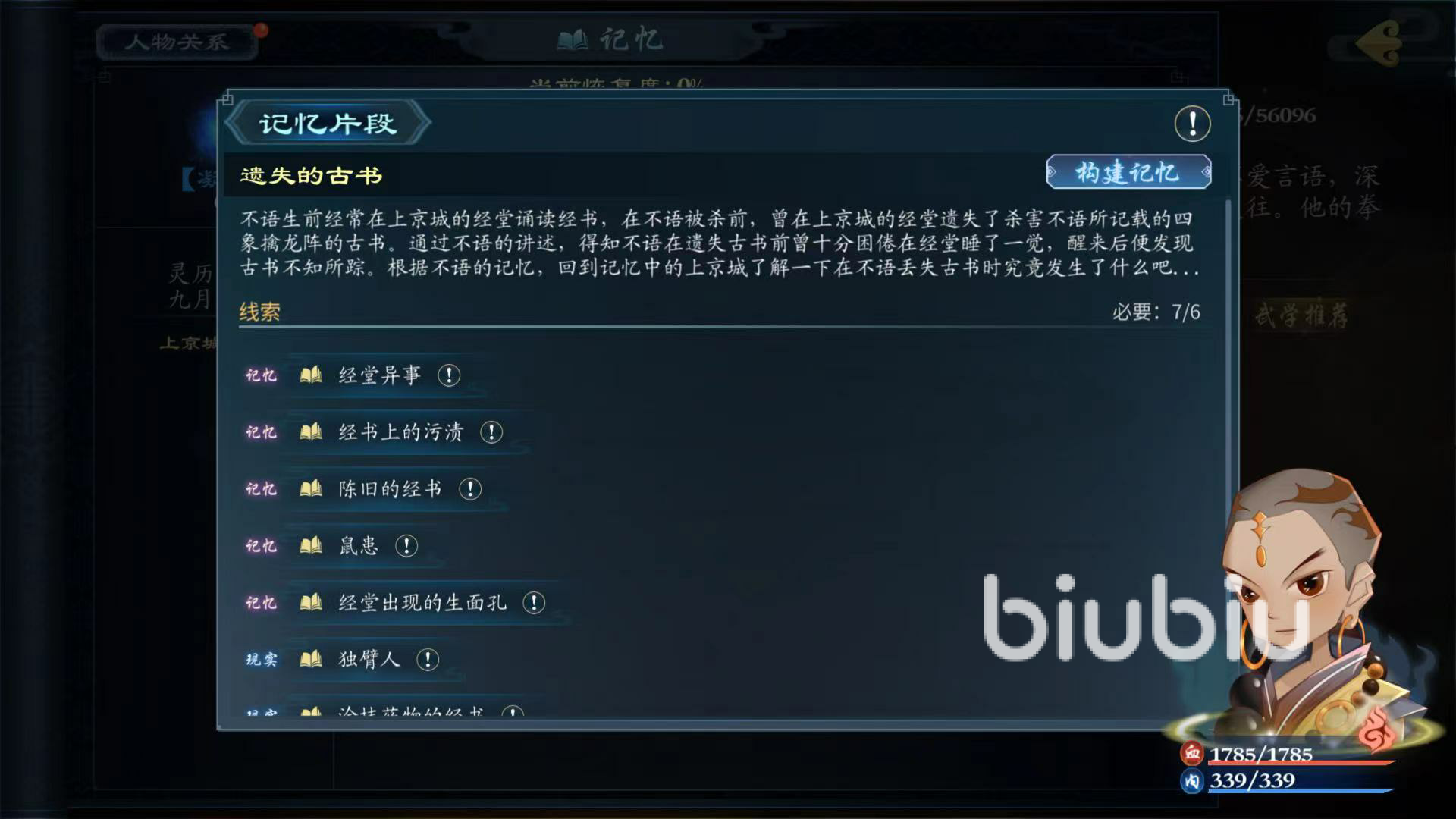 記憶點(diǎn)2,在書庫中找到春芽與他溝通,獲得經(jīng)書上的污漬記憶點(diǎn),記憶點(diǎn)3,在上京城的藏書閣中查看經(jīng)書,發(fā)現(xiàn)陳舊的經(jīng)書記憶點(diǎn),記憶點(diǎn)4,在民居找找到老鼠和破紙屑,調(diào)查老鼠,獲得鼠患記憶點(diǎn),記憶點(diǎn)5,在千福酒家與葛全溝通,完成經(jīng)堂出現(xiàn)的生面孔,回到現(xiàn)實(shí)中,與經(jīng)堂內(nèi)的魯迅溝通獨(dú)臂人,獲得獨(dú)臂人記憶點(diǎn)6線索。