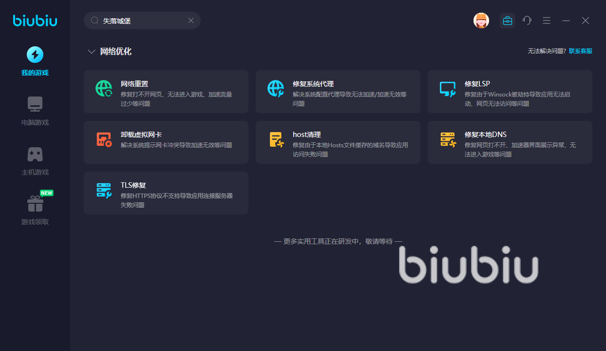 Biubiu除了能帶給你良好的網(wǎng)絡(luò)體驗(yàn)之外,還能解決好多游戲里出現(xiàn)的問題,有時(shí)候除網(wǎng)絡(luò)之外游戲要是莫名出現(xiàn)報(bào)錯(cuò),它們的解決方法基本都在biubiu的工具箱里有呈現(xiàn),就比如很常見的host清理、TLS修復(fù)、DNS修復(fù)等等,這些原本要很復(fù)雜操作才能解決的問題,在這里也都改為了一鍵式的,幾秒鐘就能解決你各種進(jìn)不去游戲的問題。