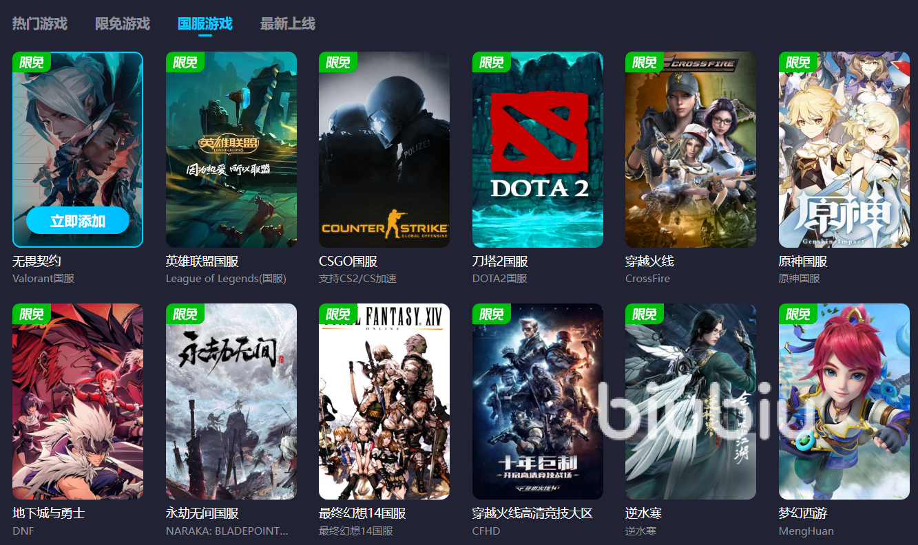 眾所周知加速器都是需要收費的,而biubiu加速器的價格非常優(yōu)惠,平臺推出的價格讓每個游戲玩家都能夠用得起,首次充值的用戶還能在此基礎(chǔ)上獲得額外優(yōu)惠,更低的價格還不到一頓飯錢。而且平臺內(nèi)的游戲覆蓋種類非常廣,熱門游戲、冷門游戲都可以搜到,面對這個價格已經(jīng)是物超所值了。最近游戲荒的玩家就可以到biubiu加速器的分類主頁挑選游戲,這里都是當(dāng)下大部分玩家的選擇。