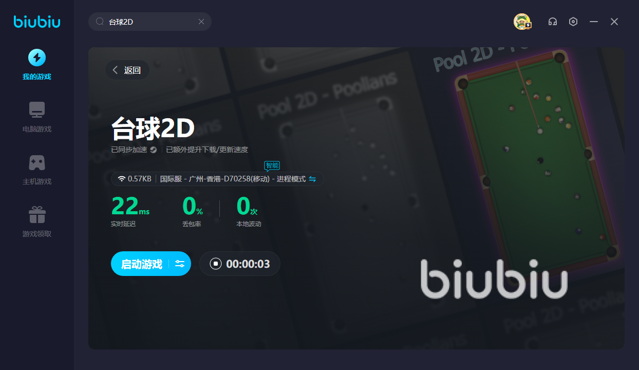 想要玩好臺球2D的話,那就需要先使用biubiu。因為只要加速過后,才能參加這場臺球比賽,畢竟該游戲目前仍然沒有國服。如果打算先玩幾把試試手感的話,新用戶可領(lǐng)取24H的免費加速;此外新老用戶均可輸入【biubiu不卡頓】,即可領(lǐng)取三天免費加速。若是打球途中卡頓的話,很容易將黑球擊進去。有了加速器后,就能避免出現(xiàn)烏龍事件,讓你準確選好想要擊打的球體。若是延遲高的話,那同樣無法完成高難度操作。只有使用加速器后,方可降低延遲,讓你在限定時間內(nèi)擊落臺球。