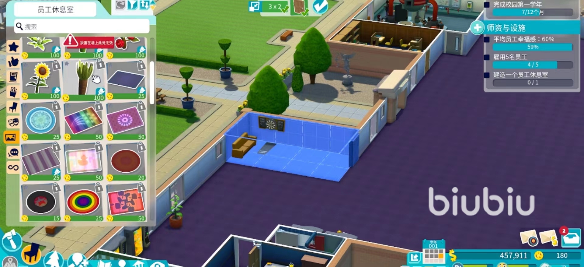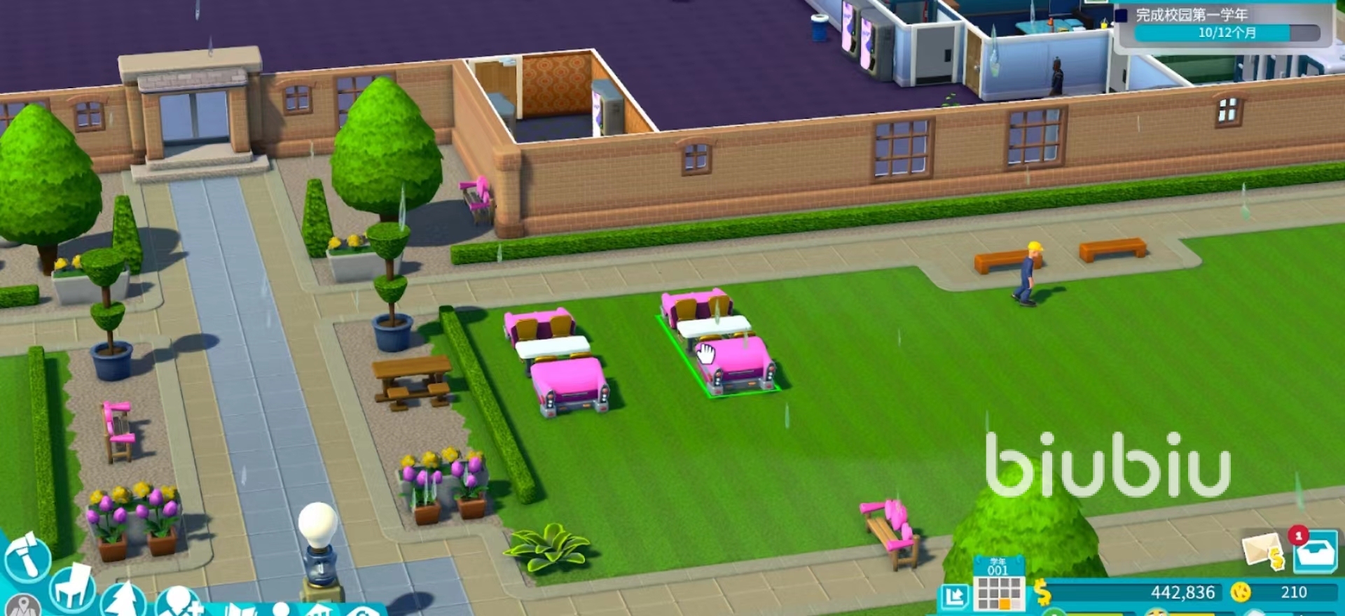 游戲的主題是學(xué)校,游戲開(kāi)局只給到了玩家一個(gè)學(xué)校的空?qǐng)龅兀唧w學(xué)校內(nèi)怎么建設(shè)、布置,都由玩家開(kāi)決定。此時(shí)玩家只用點(diǎn)擊有界面下面的錘子,即可打開(kāi)建造菜單,菜單里有各種各樣的建筑設(shè)施,并且建筑的面積,建造條件都列舉的非常清楚。只要條件滿足,玩家點(diǎn)擊它即可看到一個(gè)模型,然后帶著模型在學(xué)校的區(qū)域內(nèi)建造即可,并且玩家可以設(shè)定建筑的朝向。不同的建筑都有著各自的作用,并且建造好后玩家還可以在建筑里布置設(shè)施、家具,一些建筑還需要搭建必要的家具。
