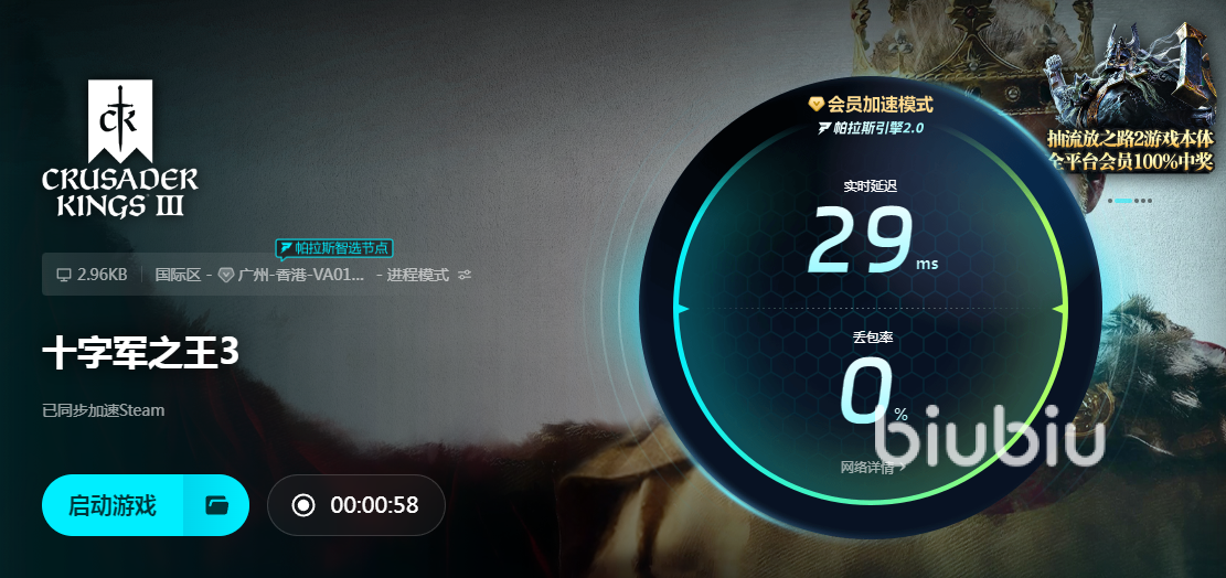 加速軟件當(dāng)然是用biubiu了,不管是校園網(wǎng)鏈?zhǔn)酵ǖ?,還是獨(dú)立游戲加速專線對(duì)提升弱網(wǎng)都是非常有效的。新用戶先免費(fèi)體驗(yàn)24小時(shí),直接找到十字軍之王3資源以后立馬就能加速起來(lái),按鍵啟動(dòng)以后用戶就能享受流暢又穩(wěn)定的網(wǎng)速,什么閃退和加載白屏統(tǒng)統(tǒng)去無(wú)蹤。