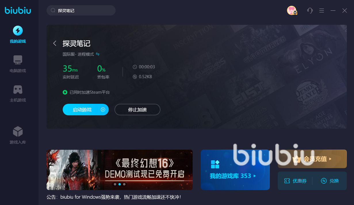 其實探靈筆記這款作品相對而言玩家數(shù)量不是很多的,在很多加速器里找都沒有找到,biubiu就可以給它加速。而且這款軟件還能夠給很多主機、掌機的游戲提供網(wǎng)絡(luò)優(yōu)化服務(wù),大家看到游戲封面左上角有綠色的限免標(biāo)志的話,那就是可以免費使用,不需要開會員。