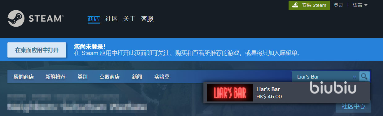 在Steam平臺上,騙子酒吧這款游戲的英文名為Liar's Bar。我們可以先打開steam客戶端或者網(wǎng)頁版,然后在右上角搜索框中復(fù)制粘貼,輸入這個英文,稍微等待一會,就會出現(xiàn)這個游戲的圖標和信息了,之后我們點擊它就可以直達下載頁面。