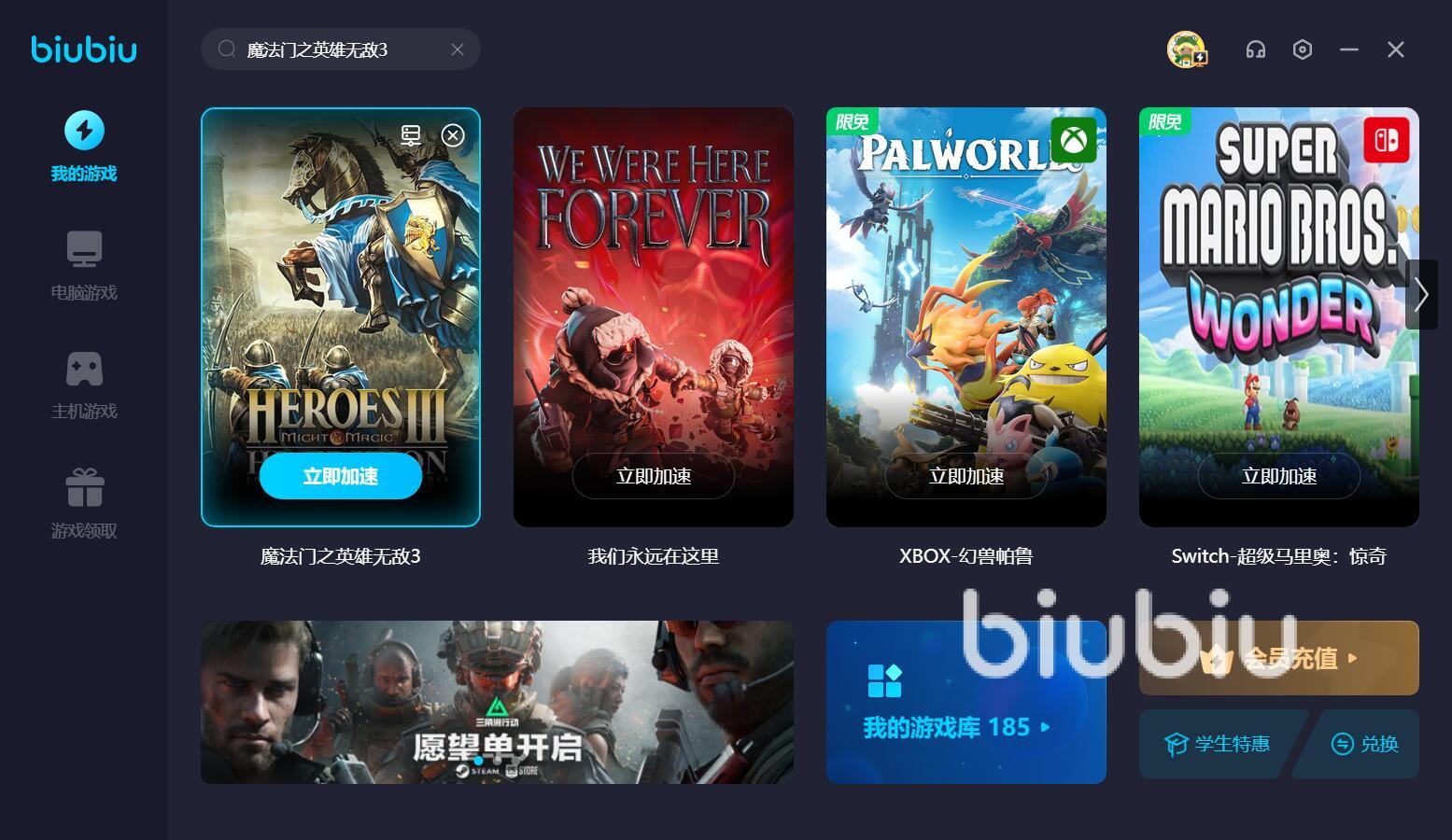平臺上線了多個福利活動,無論你是新用戶還是老用戶,只要輸入兌換碼【biubiu不卡頓】就能領到3天的免費加速時長,此外,新用戶完成注冊后,就能領到24小時的加速時長。