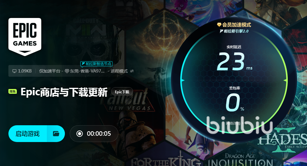 想要成功領(lǐng)取游戲,除了在規(guī)定的時間內(nèi)滿足相應(yīng)要求外,還需要玩家的網(wǎng)速一定要給力,否則可能會導(dǎo)致領(lǐng)取失敗,或者需要重復(fù)領(lǐng)取。大家可以使用biubiu來玩Epic,它長期免費加速Epic,加速以后不管是瀏覽商店還是下載游戲速度都非???,達到事半功倍的效果。
