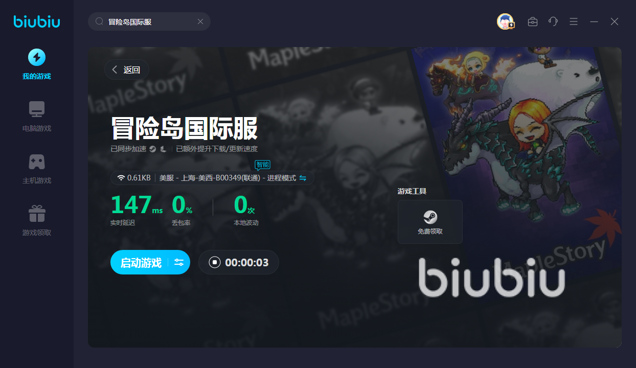 這款游戲雖然自身運(yùn)行的時(shí)候比較流暢,但如果去國(guó)際服就需要一些工具提供幫助,大家都知道在國(guó)內(nèi)登陸國(guó)際服,如果憑借自己操作去設(shè)置,雖然也可以成功,但是網(wǎng)絡(luò)極其不穩(wěn)定,并且還會(huì)帶來一些安全方面的隱患?,F(xiàn)在小編推薦大家用biubiu加速器來進(jìn)行優(yōu)化,優(yōu)化之后除了可以對(duì)游戲提供更流暢網(wǎng)絡(luò)之外,還可以幫助直接進(jìn)行跨服。具體操作方法也很簡(jiǎn)單,在biubiu搜索框中輸入冒險(xiǎn)島,在出現(xiàn)選項(xiàng)中就可以看到有冒險(xiǎn)島國(guó)際服這一項(xiàng)內(nèi)容,直接點(diǎn)擊就可以加速運(yùn)行了。在加速之后,憑借自身全球范圍內(nèi)的專線,能夠讓玩家在國(guó)際服也能享受超低延遲,輕松進(jìn)行這款經(jīng)典游戲。