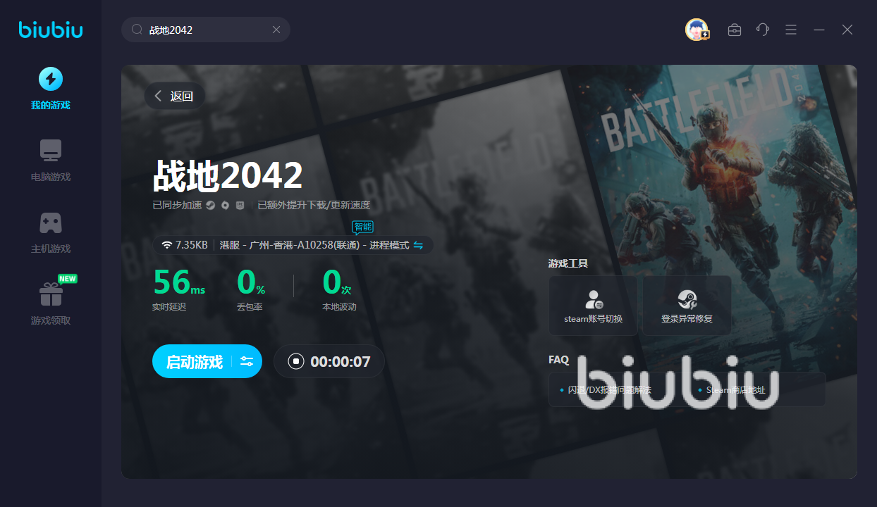 在戰(zhàn)地2042中,玩家可以體驗到非常熟悉的老戰(zhàn)地槍戰(zhàn)氛圍,在性能方面的優(yōu)化也做得非常不錯,即使是在激烈交火區(qū)域,也可以穩(wěn)定在較高的幀率,在大多數(shù)情況下都可以讓玩家獲得很爽快的體驗。但是畢竟該游戲中最有趣的是大戰(zhàn)場玩法,很多玩家最喜歡匹配的就是這一模式,現(xiàn)在大多數(shù)玩家的網(wǎng)絡(luò)在大戰(zhàn)場都會有各種各樣的問題,尤其是在場面比較激烈的時候,出現(xiàn)掉幀情況更是影響了大多數(shù)人正常游戲。這時加速器就成為了不可缺少的工具,biubiu是現(xiàn)在人氣很高的加速軟件,能夠在大家運行戰(zhàn)地2042的時候獲得更好的網(wǎng)絡(luò)環(huán)境,進而解決這一系列問題。